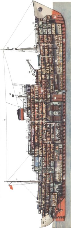 1 — верхний командный мостик; 2 — дымовая труба; 3 — ходовая рубка; 4 — штурманская рубка; 5 — каюта капитана; б — радиорубка; 7 — спортплощадка; 8 — плавательный бассейн и солярий; 9 — душ— раздевалка; 10 — кинозал; 11 — каюта командного состава; 12 — детская каюта; 13 — открытая часть прогулочной палубы; 14 — салон-веранда; 16 — читальный зал и библиотека; 16 — трапы и лифты для сообщения между палубами; 17 — пассажирские каюты; 18 — жилые помещения команды; 19 — лифт для подачи провизии на камбуз; 20 — камбуз — судовая кухня; 21 — хлебопекарня; 22— лазарет; 23 — ресторан; 24 — корабельная кладовая (краски, канаты, брезенты, блоки) и мастерская плотника; 26 — бортовой люк для входа пассажиров, приемки мелких грузов и автомашин; 26 — цистерны жидкого топлива для котлов; 27 — котельное отделение; 28 — отделение турбогенераторов; 29 — механическая мастерская; 30 — вспомогательный дизель-генератор для электрического освещения; 31 — климатическая станция для кондиционирования воздуха; 32 — провизионная кладовая и холодильник; 33 — грузовые трюмы; 34 — помещение рулевой машины; 36 — ахтерпик — кормовая балластная цистерна; 36 — помещение гребного электродвигателя (одного из двух); 37 — прачечная; 38 — почта; 39 — форпикносовая балластная цистерна; 40 — междудонное пространство — используется для хранения жидкого топлива, масла смазочного, водяного балласта, пресной воды для котлов; 41 — отсек для лага и эхолота; 42 — фок-мачта; 43 — грузовой кран; 44 — антенна радиопеленгатора; 46 — антенна радиолокатора; 46 — антенна судовой радиостанции; 47 — грот-мачта.