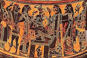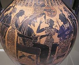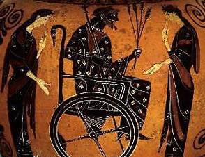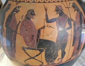 Суд Писистрата и суд Зевса. Возможно, справа изображен Писистрат в окружении богов. Писистрат атрибутирован скипетром. У Гомера цари – «скиптродержавные» – получают символы власти и законы непосредственно от Зевса, порождаются им в своем статусе – «богом рожденные», «богом вскормленные» и «богоподобные».