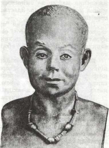 Рис. 189. Голова хлопчика з поховання донецької катакомбної культури в м. Луганську. Реконструкція М. М. Герасимова