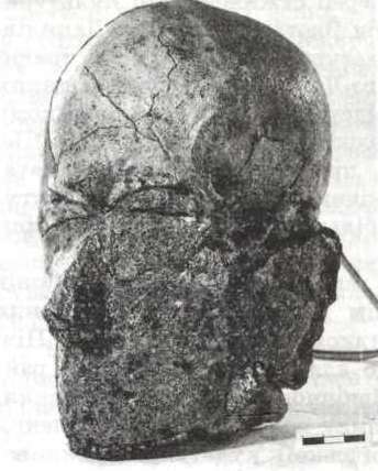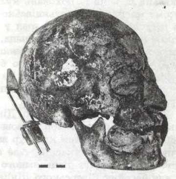 Рис. 190. Череп людини з модельованими глиняною сумішшю рисами обличчя з поховання інгульської катакомбної культури біля с. Жовтневе