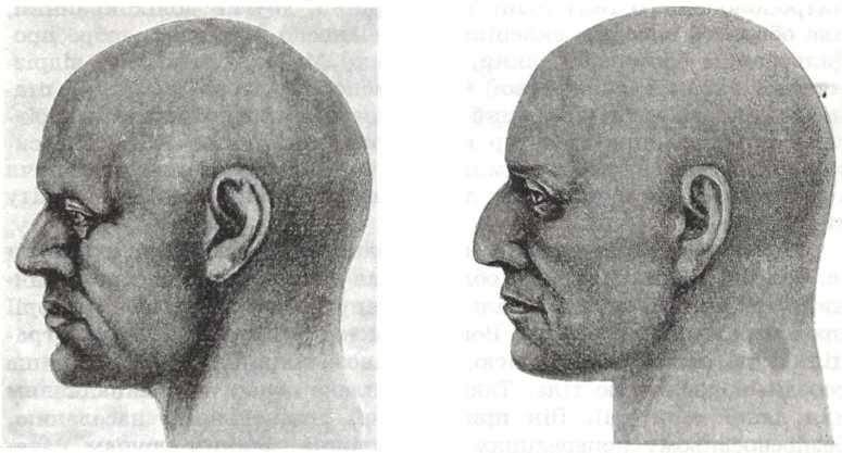 Рис. 193—194. Голови людей (чоловіків) із поховання сосницької культури біля с. Хар’ївка (поховання 1, 2). Реконструкція М. М. Герасимова