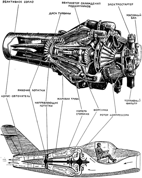 Авиационный турбореактивный двигатель. В верхней части рисунка изображен двигатель с вырезанными стенками. Внизу — возможная схема его расположения на самолете.