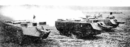 Батарея танков «Сен-Шамон» выходит в бой. Танки первых серий — с плоской крышей, овальными башенками и пушкой T.R.