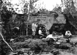 Ремонт ходовой части танка «Сен-Шамон» в полевых условиях. Танк поздней постройки, с покатой крышей.