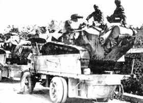 Танки «Рено» FT перебрасываются на грузовиках.