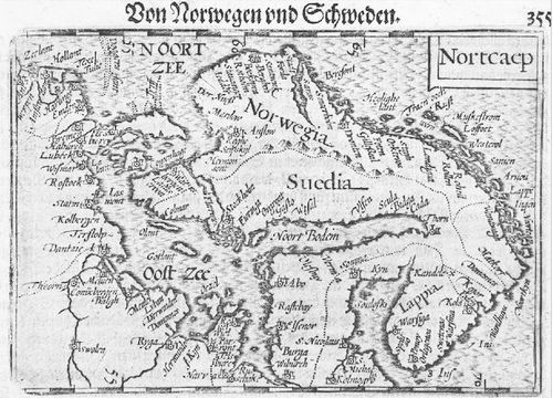 «Nortcaep». Одна из первых европейских карт, на которой обозначен Сумской острог, как крепость наравне с Соловецким монастырем. Гравюра на меди б. Лангенеса. 1606. Мидделбург, Голландия. Из частной коллекции.