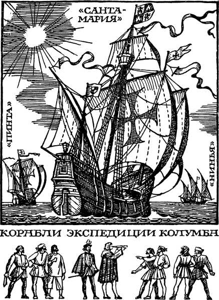 На рассвете этого дня из испанского порта Палос вышли три каравеллы, которым суждено навсегда занять почетное место в истории географических путешествий и открытий: «Санта-Мария» с Христофором Колумбом на борту, «Пинта» и «Нинья» с братьями, капитанами Пинсонами, — старшим Мартином Алонсо на «Пинте» и Висенте Аньесем, младшим, на «Нинье». Пользуясь утренним отливом, корабли заскользили по спокойным водам Рио-Тинто. Свежий ветерок шевелил на мачтах разноцветные флаги: зеленый крест на белом поле — флаг экспедиции, и королевские штандарты Изабеллы и Фердинанда с замками и львами.