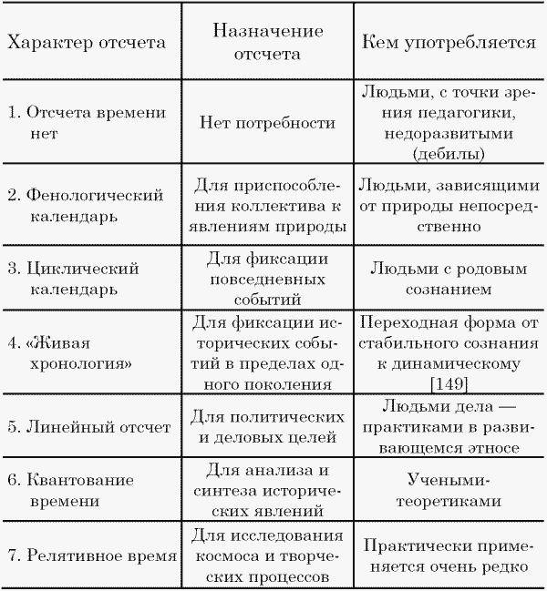 8. Сделанный обзор основных вариантов отношения разных народов к универсальной категории времени не только не дает нам права рассматривать эти варианты как ступени на лестнице эволюции, но, наоборот, позволяет сделать противоположное заключение. Люди считают время так, как им это нужно, и не применяют иные системы отсчета не потому, что не умеют, а потому, что не видят в этом практического смысла. Так, тюрки ввели линейную хронологию, как только она им понадобилась, а нужда в новой системе отсчета возникла тогда, когда из общей аморфной массы родовичей выделилась инициативная группа тарханов и бойла, которые сумели приспособить систему соседей к потребностям своего народа [86, стр. 342]. Но как только каганат пал, тюрки вернулись к циклическому счету времени, и это было не регрессом, а всего лишь адаптацией. Употребляя отсчет времени по месяцам и неделям, мы пользуемся циклической хронологией, а не линейной или квантовой. Для физика-теоретика время может быть либо ньютоновским, линейным, либо эйнштейновским, относительным, а историк, произносящий слова «Siele de Lois XIV», или «Викторианская эпоха», или «век Перикла», имеет в виду определенные кванты развития, которые переводятся на линейное время путем простого пересчета.