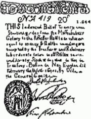 Рис. 36. Денежный билет, выпущенный 3 февраля 1690 года колонией Массачусетс в Новой Англии. Из книги Ф. Броделя „Структуры повседневности“, том. 1, стр. 475, Москва. „Прогресс“, 1986 год.