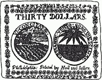 К тому времени, когда в Лексингтоне, штате Массачусетс 19 апреля 1775 года прозвучали первые выстрелы этой войны, британская система налогообложения сумела полностью выкачать из колоний все золотые и серебряные монеты. Колониальное правительство для финансирования войны было вынуждено печатать деньги.