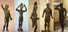 Спартанская бронза: чемпион, дискоболка готовится к упражнению, бегун (вероятно участвующий в беге со щитом, который не сохранился), прыгун (грузы в руках не сохранились), копьеметатель (копье не сохранилось). 6 в.до н.э., Музей Спарты