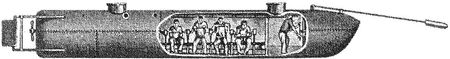 Судно было сделано из железа в виде суженного на концах цилиндра длиной 12 м и диаметром 1,8 м. Она вмещала девять человек: восемь вручную вращали привод винта, один управлял судном. Максимальная скорость составляла 2,5 узла. Правда, о лодке говорили, что она погубила больше своих матросов, чем вражеских. И действительно, приводимая в движение вручную, содержа в своем корпусе ничтожный запас воздуха, она представляла собой настоящий плавучий гроб. Три раза она тонула со всем экипажем.
