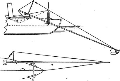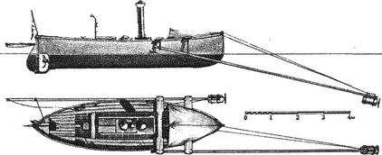 Один, мощностью 10 л. с., вращал гребной винт, другой, 15-сильный, — гусеницы. Поэтому через заграждения можно было перелезать подобно танку. К месту операции это сооружение предполагалось доставлять на буксире миноносцем, далее со скоростью 4 узла по воде его перемещал электродвигатель, а боны преодолевались на гусеницах.