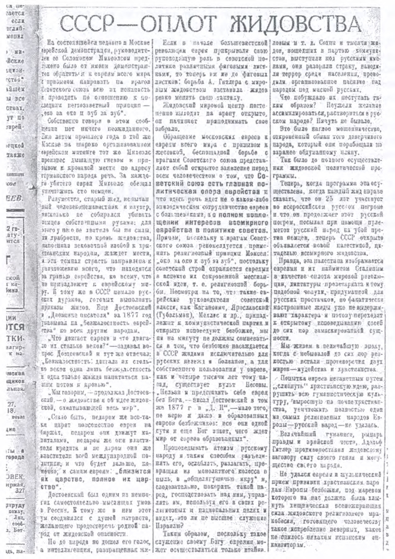 Одна из антисемитских статей в газете «Голос Крыма» (№49, 14 июня 1942 г., с.1), выпускавшейся оккупационными властями в Симферополе. Из фондов ГААРК.