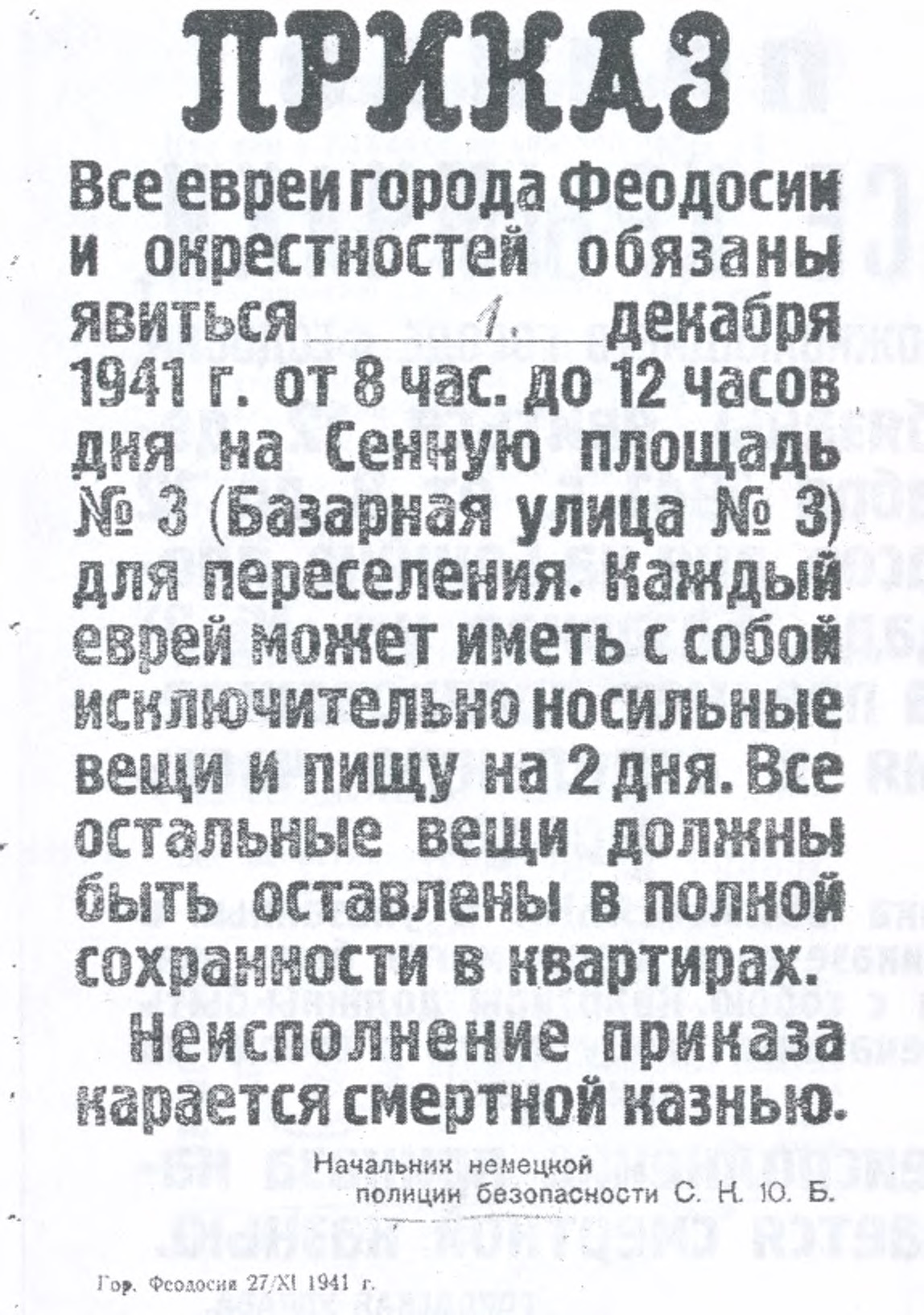 Приказ начальника немецкой полиции безопасности зондеркоманды 10б о явке евреев г. Феодосии. Издан 27 ноября 1941 г. ГААРК, ф. P-1458, оп.1, д.2, л.10.