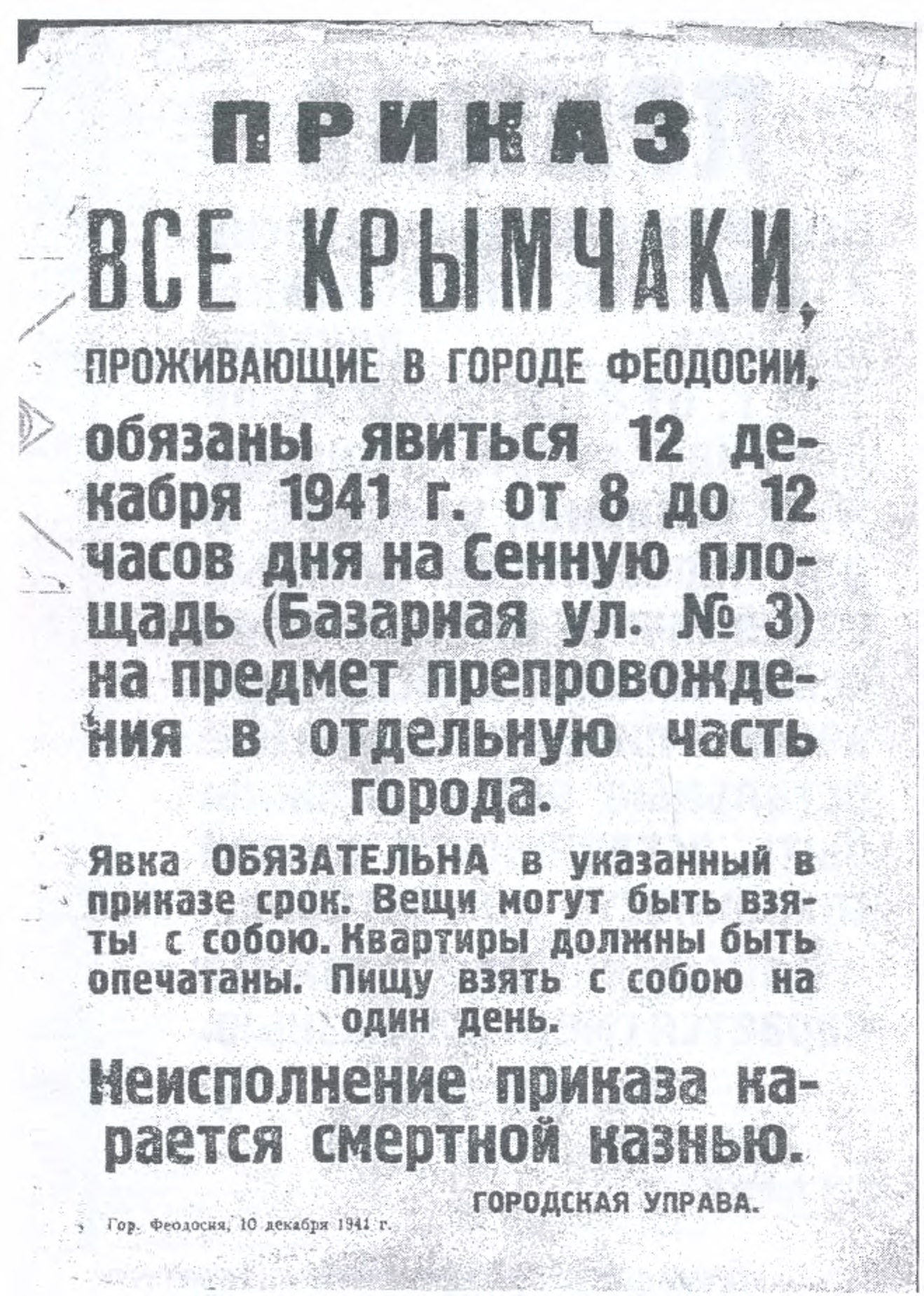 Приказ за подписью городской управы Феодосии о явке крымчаков г. Феодосии. Издан 10 декабря 1941 г. ГААРК, ф. P-1458, оп.1, д.З, л.2.