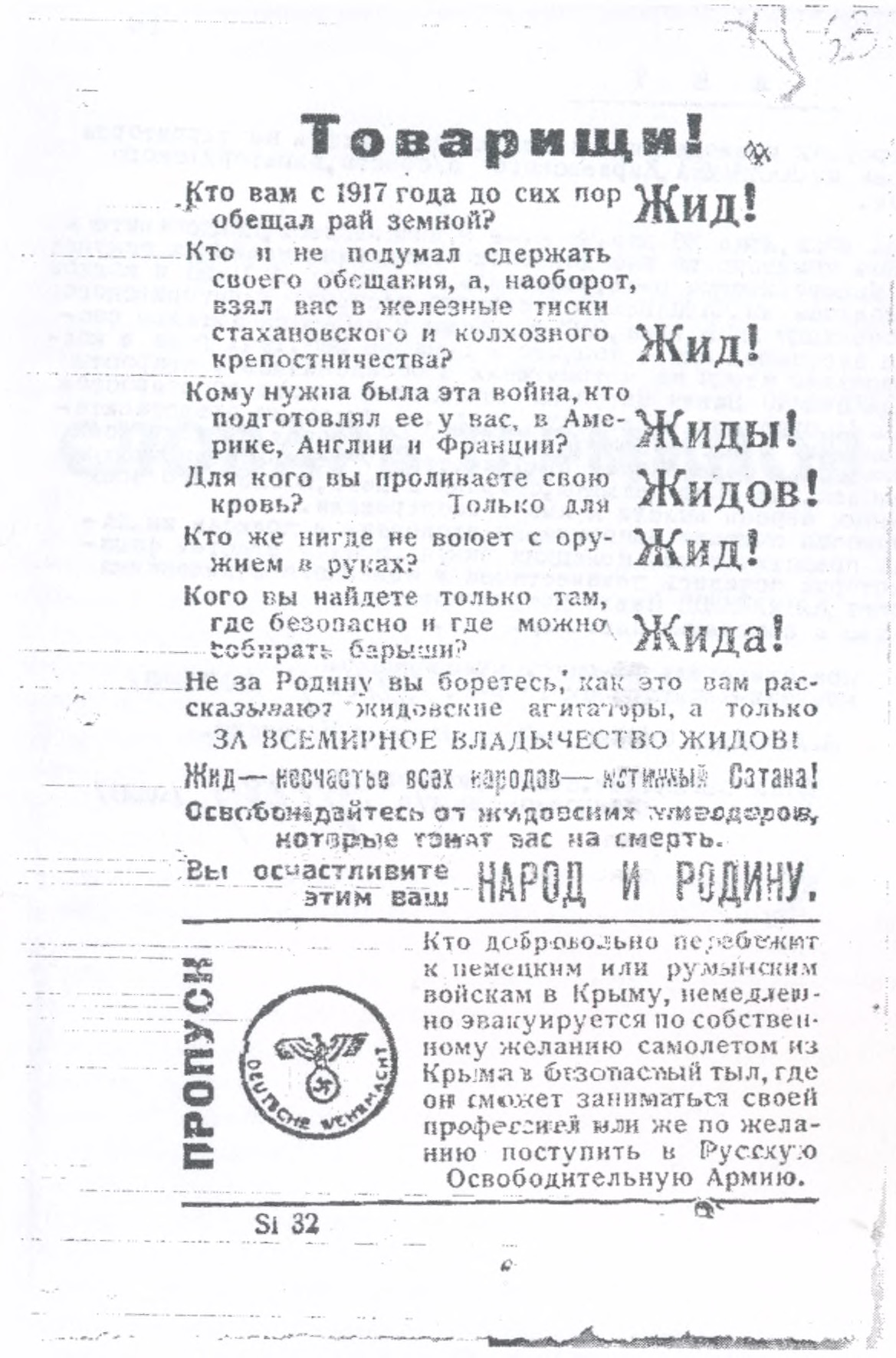 Листовка немецких оккупационных властей в Крыму, адресованная бойцам Красной армии, содержащая призыв переходить на сторону немецко-румынских войск. ГААРК, ф. П-156, оп.1, д.25, л.63.