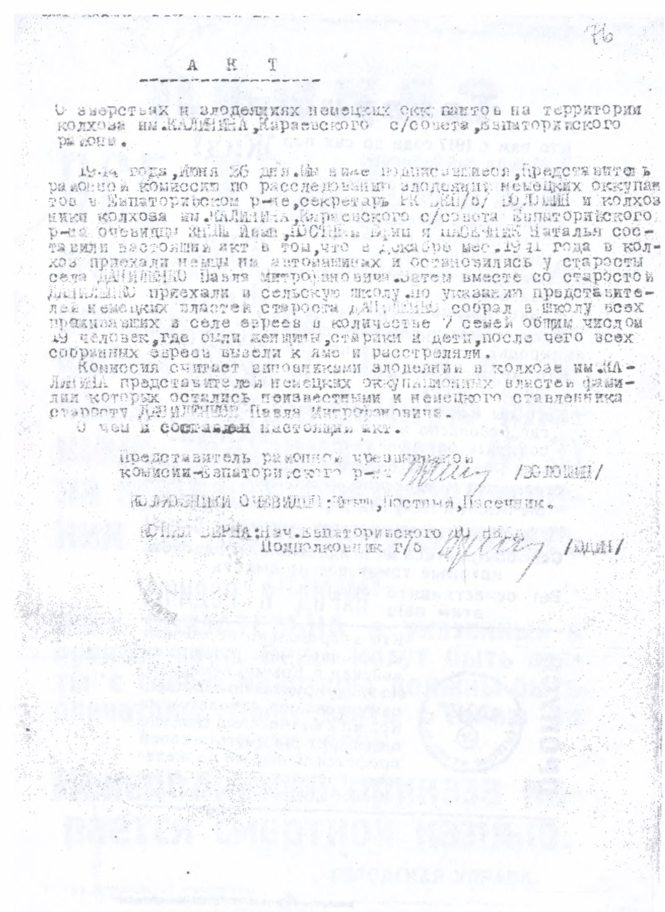 Один из актов Крымской Республиканской чрезвычайной комиссии по установлению и расследованию злодеяний немецко-фашистских захватчиков и их сообщников. ГААРК, ф. P-1289, оп.1, д.5, л.76.