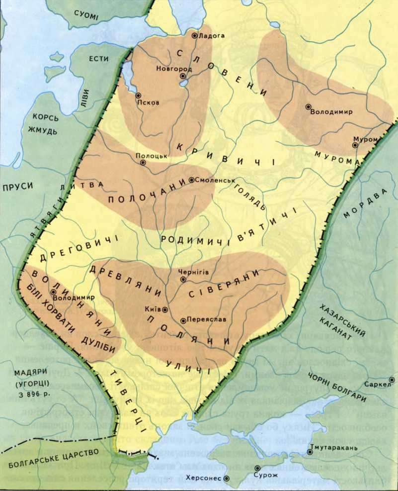 Почнемо із з’ясування етнічної ситуації східних слов’ян напередодні їх політичної консолідації. “Повість минулих літ” у вступній частині дає широку картину розселення слов’ян взагалі і східних зокрема. “Тако же и ти слов?ни пришедше и св?доша по Дн?пру и нарекошася поляне, а друзии древляне, зане с?доша в л?с?х; а друзии с?доша межю Припетью и Двиною и нарекошася дреговичи; инии с?доша на Двин? и нарекошася полочане, р?чьки ради, яже втечеть въ Двину, имянемъ Полота... Словене же с?доша около озера Ильменя..., а друзии с?доша по Десн?, и по Семи и по Сул? и нарекошася с?веръ”[493].