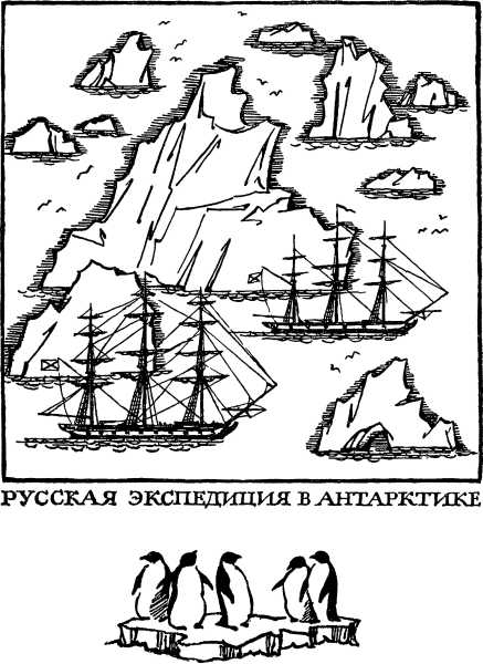 «Восток» и «Мирный», два небольших суденышка, неслись к югу под всеми парусами, рассекая угрюмые волны; и птицы летали над ними — огромные белые альбатросы; и темные фрегаты и акулы неотступно следовали за кораблями, и киты, словно приветствуя моряков в этих нелюдимых широтах, пускали свои великолепные фонтаны.