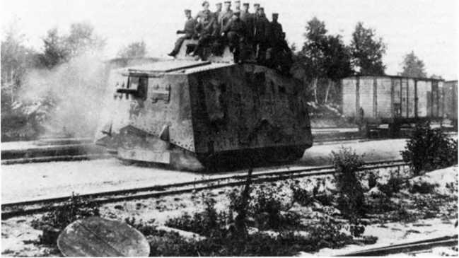 Танк А7V (с корпусом «Рёхлинг» второго заказа и удлиненной выхлопной трубой) из состава 2-го танкового «штурмового отделения» проходит железнодорожную станцию. Большая часть экипажа разместилась на крыше машины.