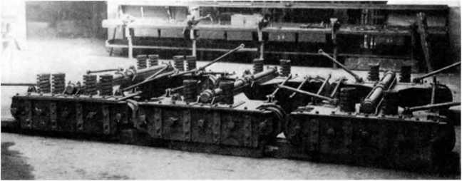 Собранные тележки ходовой части A7V с пружинами, осями и тягами подвески.