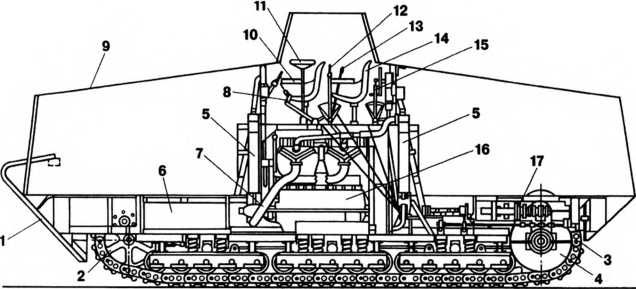Продольный разрез опытного танка на шасси A7V (макет, построенный в январе 1917 г.): 1 — «нос», 2 — направляющее колесо, 3 — гусеничная цепь, 4 — ведущее колесо, 5 — радиаторы, 6 — защищенный бак для горючего, 7 — выхлопная труба, выведенная под днище корпуса, 8 — педаль сцепления, 9 — корпус, 10 — сидение командира, 11 — рулевое колесо («волан»), 12 — рычаг переключения передач, 13 — рычаг тормоза, 14 — сидение водителя, 15 — рычаг заднего хода, 16 — двигатель, 17 — бортовая передача.