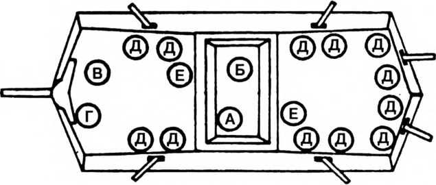 Схема размещения экипажа танка A7V: А — водитель, Б — командир, В — заряжающий, Г — наводчик орудия, Д — пулеметчики, Е — механики.