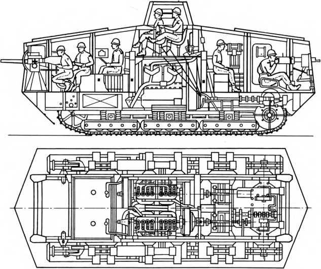 Вертикальный и горизонтальный продольные разрезы танка A7V (с тумбовой установкой орудия) позволяют увидеть особенности компоновки машины.