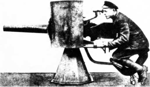 Тумбовая установка 57-мм пушки «Максим-Норденфельд» со щитами бронемаски, оптическим прицелом и сидением наводчика. Обратим внимание на ограждение, спусковой механизм, маховик механизма наводки орудия и ролик под сидением наводчика.