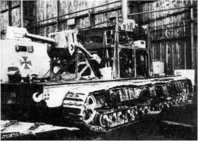 «Козловой» вариант установки 57-мм пушки «Максим-Норденфельд» на шасси A7V № 506. Обратим внимание на подвижные щиты бронемаски и противовес установки. Позади виден бронекорпус «Рёхлинг» первого заказа.