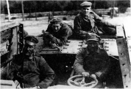Танкисты 3-го «штурмового отделения» позируют перед танком A7V № 503 «Хейланд». Танк имеет корпус «Крупп» (первоначально — «пулеметного» типа, позднее переделанный под «пушечный»), тумбовую установку орудия, удлиненную выхлопную трубу и облегченный вариант бронирования кожухов пулеметов.