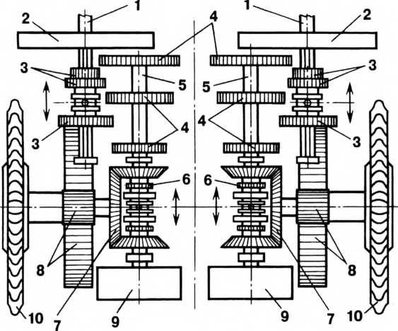 Схема трансмиссии танка A7V: 1 — носок коленчатого вала, 2 — главный фрикцион, 3 — скользящие шестерни ведущего вала, 4 — шестерни передаточного вала, 5 — ведущий вал, 6 — подвижная втулка конической передачи, 7 — коническая шестерня бортового вала, 8 — бортовой редуктор, 9 — тормоз, 10 — ведущее колесо.