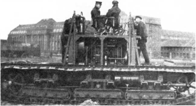 Первое рабочее шасси A7V на испытательном полигоне завода в Берлин-Мариенфельд. Начало апреля 1917 г. Видно устройство ходовой части, установка двигателей и глушителей. Сидения на площадке управления еще установлены навстречу друг другу.