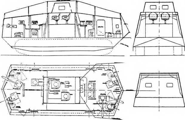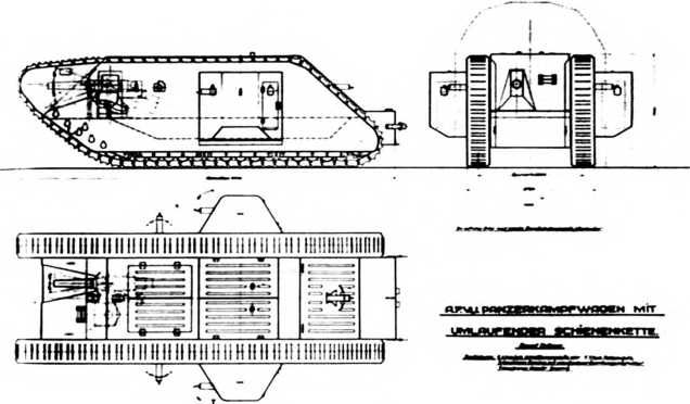 Эскизный проект танка A7VU-3 с пулеметными спонсонами и орудийной установкой в передней части корпуса.