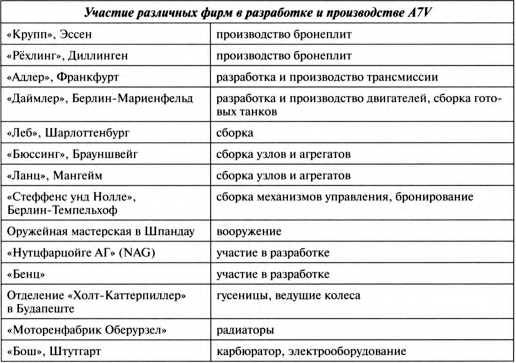 В бою танки старались поддерживать зрительную связь, но сигналы флажками были плохо видны, и управление внутри танковых подразделений на практике осуществлялось по принципу «Делай, как я», при необходимости — посыльными. В целом конструкция танка A7V воплощала в себе идею «подвижного форта», более приспособленного для круговой обороны и поддержки действий пехоты огнем, нежели дня прорыва обороны противника и поддержки пехоты. Несмотря на обильное вооружение, кругового обстрела в прямом смысле слова не получилось: из-за ограниченных углов наведения орудия два сектора в переднем направлении представляли собой мертвое пространство. Основным производителем A7V был завод «Даймлер-Моторен-Гезельшафт» (Daimler-Motoren-Gesellschaft) в Берлин-Мариенфельде. На этом же заводе, кстати, собирались и машины «Мариен-Ваген». Ручная сборка и доводка по месту сказались на внешнем виде танков. Стоимость постройки одного танка A7V в ценах 1917–1918 годов составляла 250000 германских рейхсмарок, из них 100000 марок приходилось на бронирование. В течение года — с октября 1917-го по сентябрь 1918 г. было собрано всего 20 A7V. Для сравнения: в 1917 году предприятия Германии в среднем выпускали каждый месяц (!) около 3000 легких и 400 тяжелых артиллерийских орудий и 1600 самолетов, во Франции в 1917 году в месяц строилось в среднем около 50 танков, в Великобритании — около 40 танков.