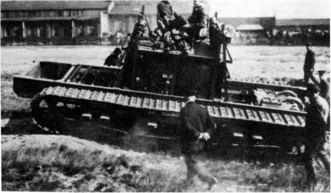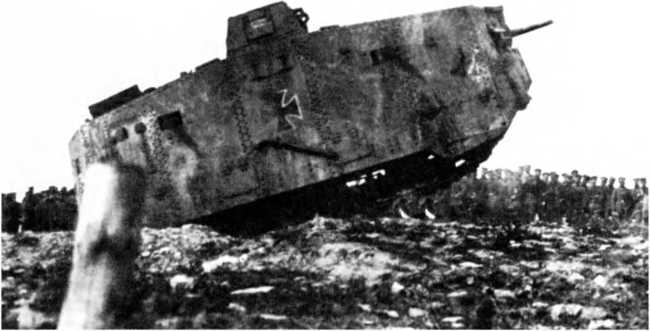 Танк A7V c корпусом «Крупп» демонстрирует на учениях способность преодоления препятствий.