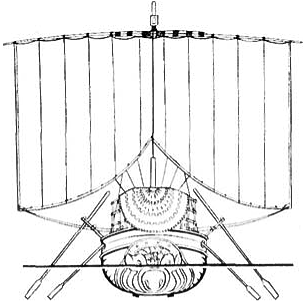 На рисунке показан один из вариантов греческой биремы (70 год до н. э.). Эти узкие стремительные суда строились без шпангоутов[18], по наружным шаблонам, с креплением обшивки нагелями[19], уже применявшимися на египетских судах, но с той разницей, что греки использовали круглые нагели, оба конца которых надпиливались. В такой распил вбивались небольшие деревянные клинья, изготавливаемые из акации, сливы или терна. Таран обычно крепился к килевому брусу и выполнялся в виде трезубца или кабаньей головы. Форштевень в верхней части тарана имел клюз[20], в который заводился прочный трос для соединения нескольких судов при сомкнутой атаке.