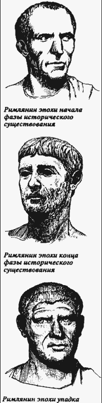 Возрастное состояние этноса довольно отчетливо проявляется в физиогномике. На рисунках, выполненных худ. Н. Симоновской по античным скульптурам, изображены римляне трех фаз этногенеза. Первый – человек волевой, с чувством долга; второй – эмоциональный, неустойчивый, не заслуживающий доверия; третий – тупой, жестокий, упрямый.