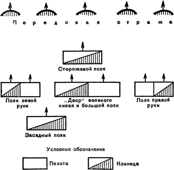 В походе русское войско двигалось следующим образом. Впереди, на расстоянии нескольких переходов, шел сильный сторожевой отряд (крепкая «сторожа»), за ним — авангардный передовой полк. Следом двигались главные силы: «большой полк», полки правой и левой руки. Замыкал походную колонну засадный полк, который в походе играл роль арьергарда. Такое расположение войска в походе позволяло быстро принять боевой строй, состоявший из тех же основных частей.
