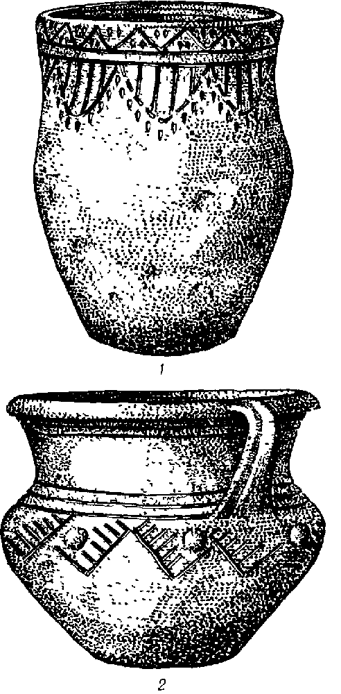 Посуда племен тшинецко-комаровской культуры: 1 — с. Здвижка Житомирской области; 2 — Ровенская область