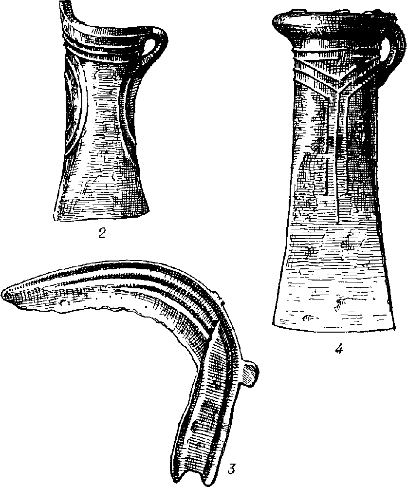 Орудия труда среднего и позднего периодов эпохи бронзы племен Закарпатья: 1 — мотыга; 2, 4 — кельты; 3 — серп