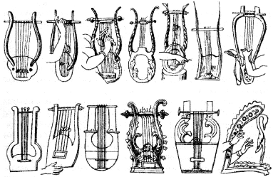 В самых древних лирах нижней частью корпуса служил панцирь черепахи (хороший резонатор для звука!), а верхней – два рога козы. В более поздних кифарах полый корпус изготовлялся из дерева или металла. Лиры изображены в верхнем ряду кифары – в нижнем