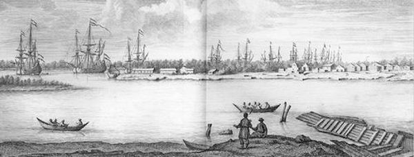 Вид на соломбальскую судоверфь с правого берега. Гравюра К. де Бруина 1711 г.