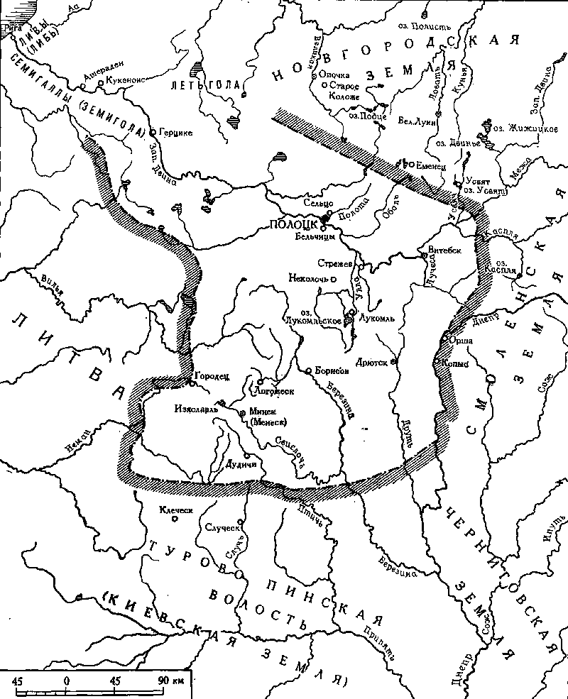 Княжеская власть здесь не была особенно сильна, и Полоцкая земля распалась на несколько довольно самостоятельных уделов: Минск, Витебск, Друцк, Изяславль, Стрежев и др.