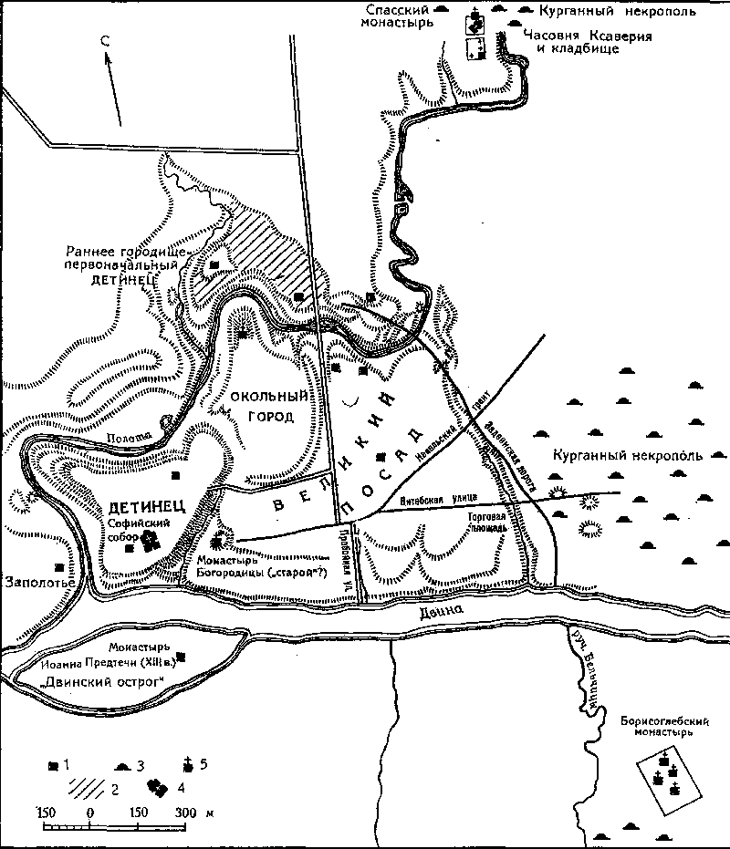 1 — места археологических исследований; 2 — район древнейшего поселения; 3 — курганы; 4 — развалины древних каменных зданий (до начала XIII в.); 5 — (древнейшие храмы)