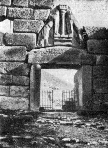 Львиные ворота в Микенах (Южная Греция, II тысячелетие до н. э.). По сторонам колонны стоят два льва (несомненно лунные животные)
