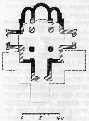 План Архангельского собора XIII в. (черным выделены стены, основанные на найденных древних фундаментах; пунктиром — контур существующего собора XVII в.). Реконструкция С. Л. Агафонова.