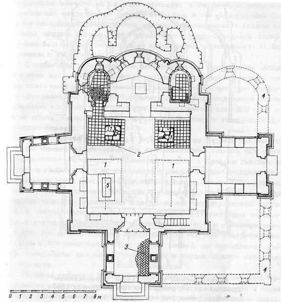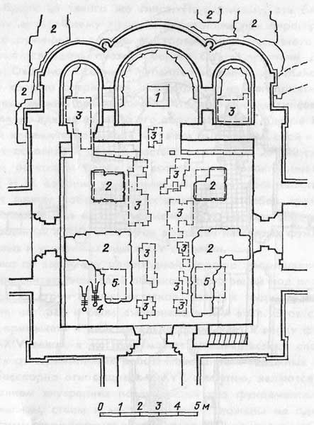 Архангельский собор. План с нанесением древних частей, раскрытых при раскопках 1960 г.: 1-престол собора XVII в.; 2-остатки фундаментов XIII в.; 3-остатки пола XIV в.; 4-захоронения XV е.; 5-возможное положение западной пары столбов собора XIV в. (в случае, если бы план этого собора соответствовал контуру стен XVII в.)