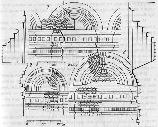 Сравнение архитектурных профилей карнизов и закомар: 1-Успенской и 2-Евфимьевской церквей Печерского монастыря; 3-Архангельского собора. Схема С. Л. Агафонова.